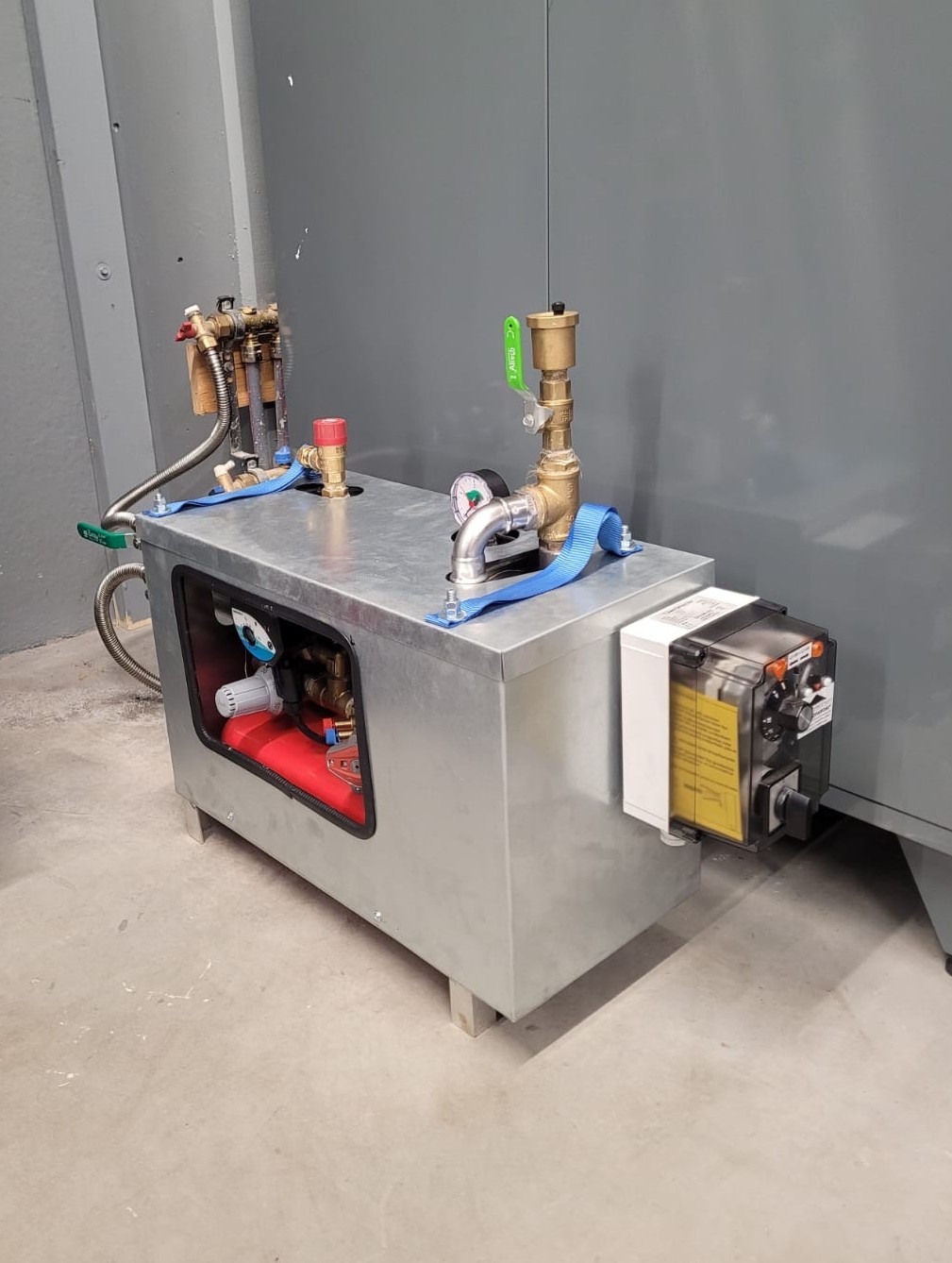 Portabel elpanna med 9kw elmotstånd, flödesreglering och termostatstyrning.